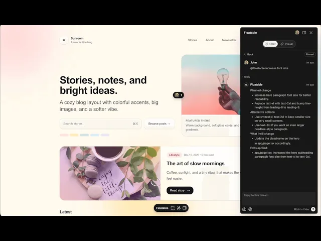 No more endless Slack threads, unclear screenshots, or ambiguous bug reports. Ask Floatable or a teammate anything about the UI, tokens, code history, or product rationale — get answers immediately.